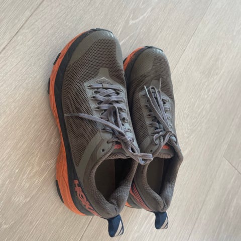 Hoka One One fottursko i størrelse 39. Egnet for fotturer med god demping og grep. Skoene har en kombinasjon av grå og oransje farger og er designet for komfort og stabilitet under turer.Bruker ikke lengre pga kjøpt nytt for ikke så lenge.Kan sendes kjøper betaler frakt