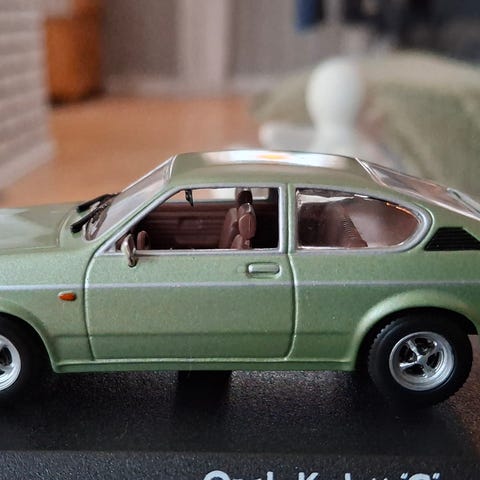 Opel Kadett 1.9 GT/E modellbil med gul og svart farge. Detaljert miniatyrbil med fokus på nøyaktig gjengivelse av originalmodellens design.