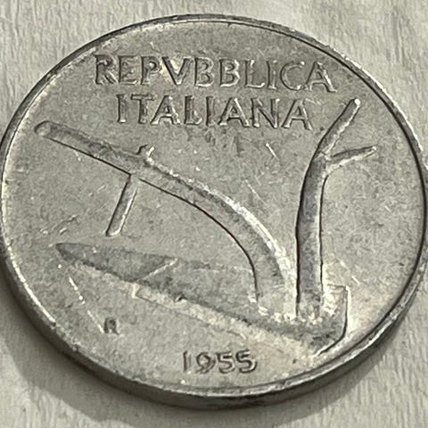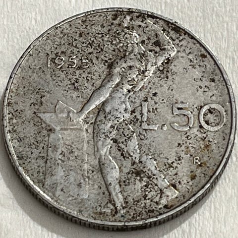 Italiensk 50 Lire mynt fra 1955 med motiv av en mann med hammer på forsiden og profil av en kvinne med laurbærkrans på baksiden.