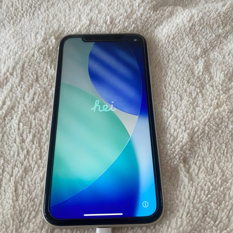 Apple iPhone 11 med 128 GB lagringskapasitet. Telefonen har en feilfri, lite riper på tlf. - alltid brukt beskyttelse. iOS versjon 18.6.2. Batteritilstanden viser maksimal kapasitet på 81 %, med optimalisert batterilading aktivert. Telefonen er hvit/sølv.