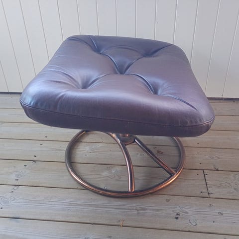 Stressles med fotskammel. Fra 80-tallet og i veldig god stand. Noe "patina" på armlenene og en liten skrape på ryggen. Ellers så godt som strøken.