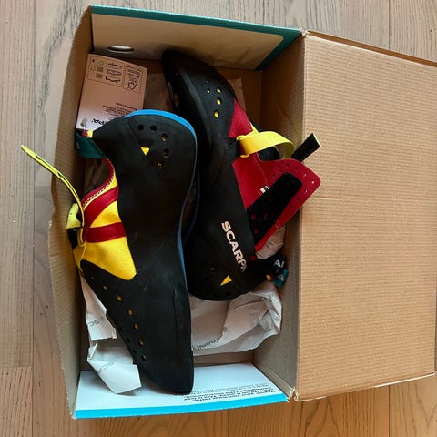 Jeg kjøpte et par Furia Air sammen med et par Scarpa Veloce str. 42.5, som er klatreskoen jeg bruker til vanlig. Jeg liker myke klatresko og hadde lyst til å prøve Furia Air, som er spissere, smalere, litt mykere og litt lettere enn Veloce. Men Furia Air str. 42.5 ble rett og slett litt for smale for min fot, som er forholdsvis bred (se bilder).