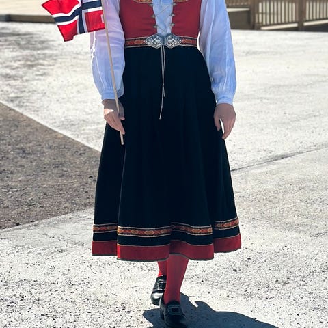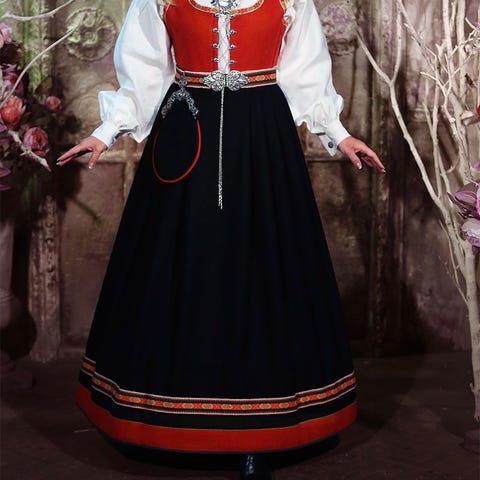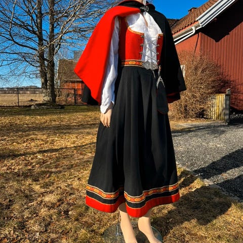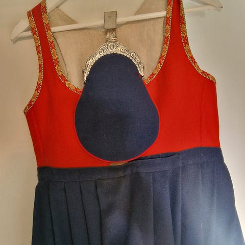 Livvidde 82 cm, bryst 90 cm, lengde på stakk 100 cm, hel lengde 145 cm.
