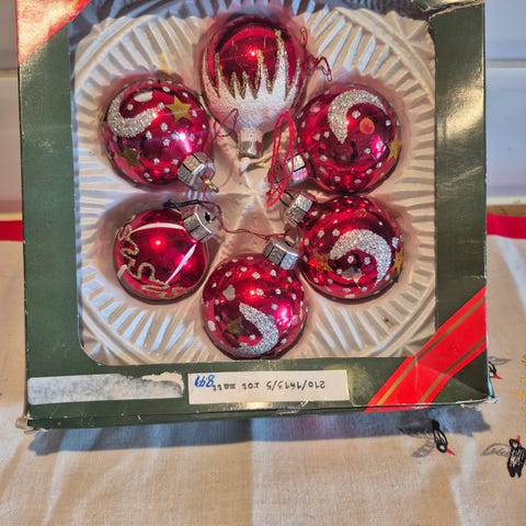 De måler ca fra 4,5 til 7cm. Noe slitasje på dekor og litt småskader på halser men henger godt. Sendes samlet.