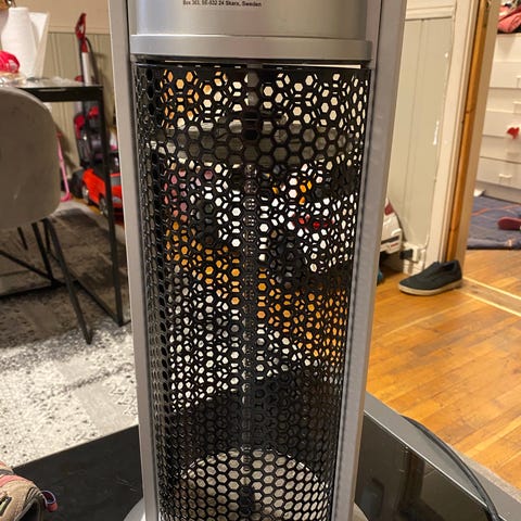 Brannfare varmeovn med effekt på 250 watt og spenning på 220 volt. Varmeovnen har en konisk metallkonstruksjon med beskyttelsesgitter foran. Egnet for oppvarming i mindre områder.