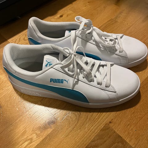 Puma sneakers joggesko i størrelse 45. Fargen er beige og materialet ser ut til å være semsket skinn. Skoene har snøring og en enkel, klassisk design.