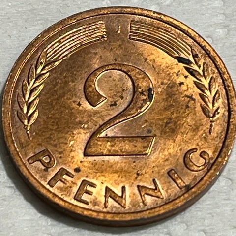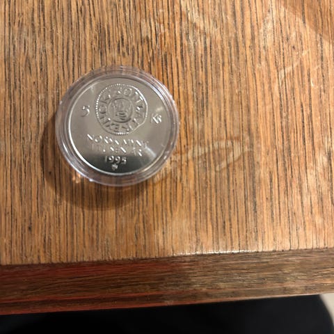 Norsk 10 øre mynt fra 1924 med hull i midten. Mynten har detaljer som kongekronen og årstallet preget på den ene siden, samt valør og dekorative elementer på den andre siden.