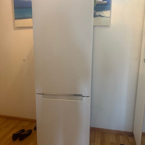 Kjøleskap med fryser under. Inneholder flere glasshyller og skuffer for oppbevaring.