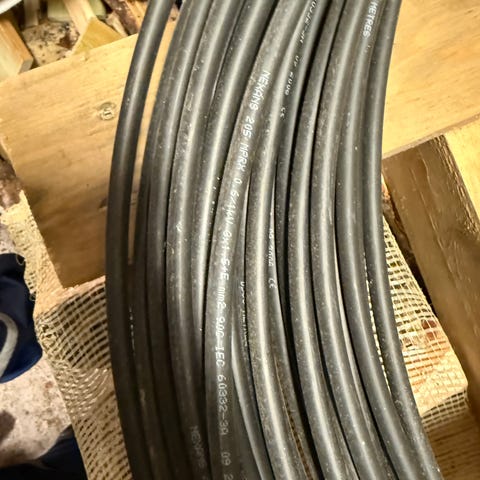 Stor rull på 10m og avkapp på litt over 2.5m som følger med gratis. Kabelen er ny men har ligget ubrukt under presenning utendørs.