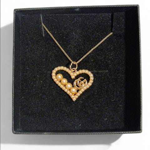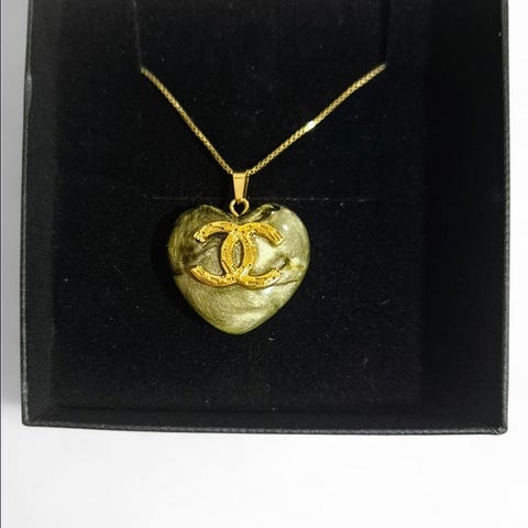 Nydelig ubrukt halskjede fra Chanel, re-designet av et vintage anheng. Anhenget er en hvit hjerteformet stein, med gull CC monogram logo på front! Chanel’s stempel på baksiden, made in france, kjedet har også sine Gulldouble stempler.
