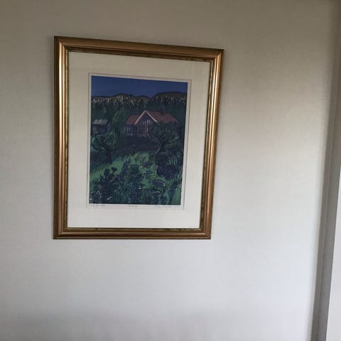 Ytre mål ramme ca 34x27 cm, motiv ca 10,5x9,5 cm. Noen småhakk i ramme.