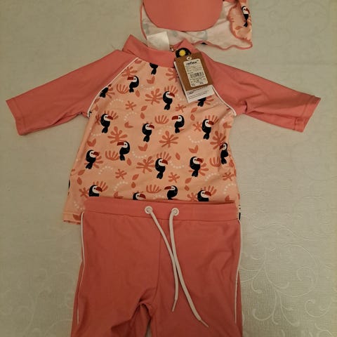 UV klær / badetøy i str 86/92 fra reflex og solhatt / sommerlue fra maximo. En heldress, en topp og en lyseblå med hvit blomst fra ukjent merke 😊💦