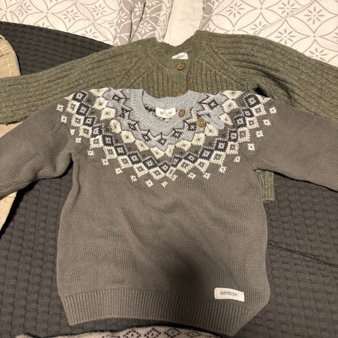 Newbie klespakke til gutt med genser / cardigan i str 86, samt tre bukser i str 80 😊 en ekstra bukse kan fåes med gratis.