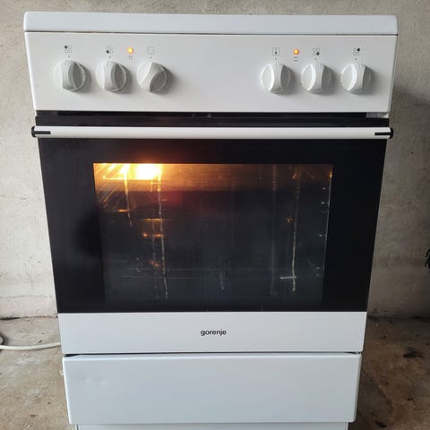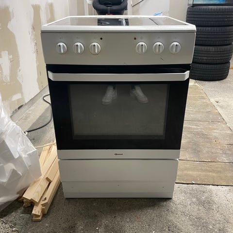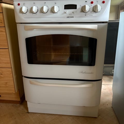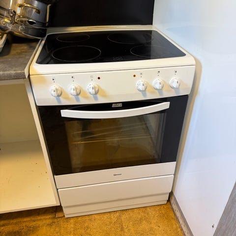 Beha keramisk komfyr med keramisk kokeplate. Komfyren har flere brytere for temperaturkontroll og en ovn med rist. Farge: hvit.