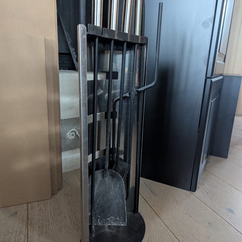 Vedstativ med utstyr selges. Den er i sort smijern kledd med aluminium inni.