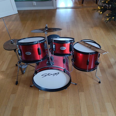 Helt nytt trommesett 3+. Nypris 499:-. Kun prøvd. Liten pall som ikke er med på bilde følger med. Selges for 300,- + ev. frakt.