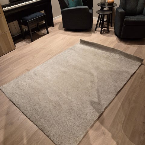 Teppet ble kjøpt ny i høsten 2022 og har kun vært brukt under et rundt bord.