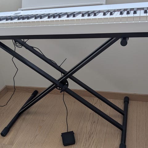 Dette er et utvidet sett som inkluderer stativ, pianokrakk, pedal og notestativ.