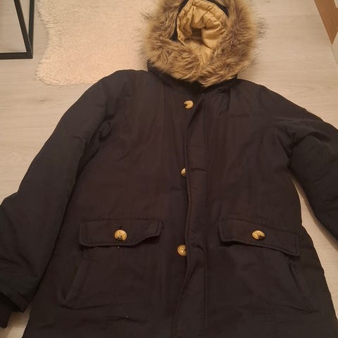 Jakken har hette med pelskant og er laget av en blanding av materialer som inkluderer bomull, polyester og dun, noe som gir varme og komfort. Passer til utendørs bruk.