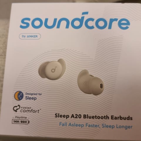 Selger Soundcore Sleep A20 Bluetooth-ørepropper, utviklet for bedre søvnkvalitet. De er kompakte, svært behagelige å bruke og sitter stabilt i øret gjennom hele natten – også når du sover på siden. Øreproppene er laget for komfort over tid og passer godt til deg som ønsker roligere netter.