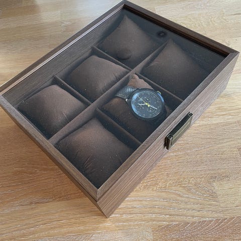 Klokkeboks / Watch Winder - for 2 klokker med svart design og med hvite sting. Inkluderer en roterende urkasse (2 klokker) med gjennomsiktig plastlokk og USB-tilkobling for strømforsyning. Egnet for oppbevaring og opplading av automatisk klokker...