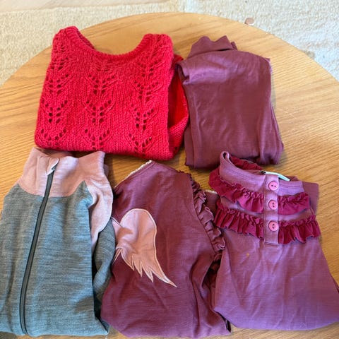 barneklær ull for jente i størrelse 116 med flerfarget design. Inkluderer ulike plagg i flere farger og materialer, egnet for barn.