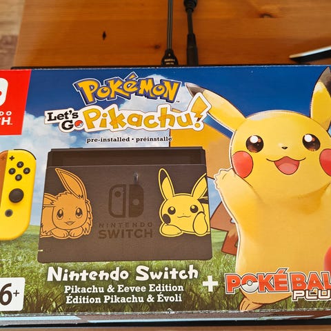 Nintendo Switch spillkonsoll med standard Joy-Con-kontrollere i blå og rød farge. Inkluderer også en Donkey Kong Pro-kontroller i brun og oransje farge. Donkey Kong konsollen kommer også med en kabel som du kan koble til Nitendo. Switch doken på bilde 5 brukes til og koble Nitendon til tv og vis den har lav battery. Vis original kontrolle blir lavt batteri så leger du den på siden av Nitendon, å legger da Nitendon i switch doken.
