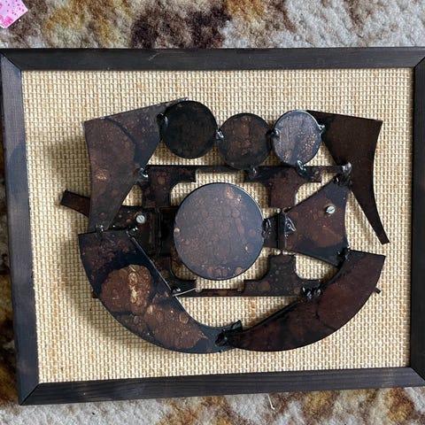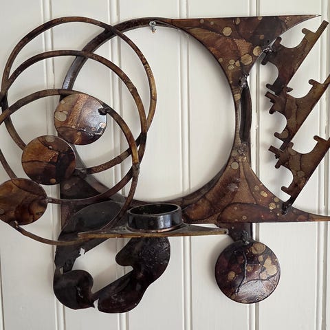 Moderne klassiker! Brutalistisk 70-talls metallkunst, antagelig Henrik Horst. Oksidert, etset og patinert stål montert på strie-kledd sponplate med mørkbeiset ramme. Rammemål 92x42cm, vekt 8,5kg. Oppheng bak. Pent arbeid for noen som liker brutalistisk design og med priser som er vesentlig høyere utenfor Skandinavia.