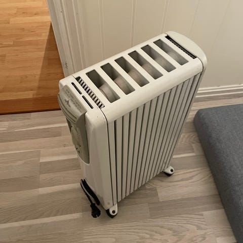 DeLonghi oljeovn radiator med flere varmeelementer og justerbare termostatinnstillinger. Designet for effektiv oppvarming av rom, med hjul for enkel flytting.