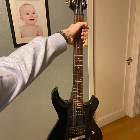 En meget tøff el-gitar luftes for salg. Gitaren ser rimelig strøken ut. NB! Har kun satt en pris da jeg ikke har nok kunnskap om akkurat denne gitaren. Å dette er høyst trolig en kopi da jeg ikke finner serienummer. Utstyrt med to humbuckere av ukjent merke med kraftig, moderne output som passer godt til rock og metal. Gitaren fikk service i 2024 med nye strenger og smøring av hals, osv.