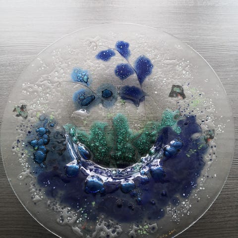 Dekorativ lysestake i tykt, resirkulert glass, produsert i Spania og merket “Recycled glass – Made in Spain”.