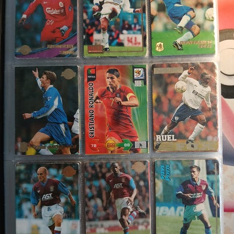 Fotballkort med ulike spillere fra forskjellige klubber og nasjonale lag. Kortene inkluderer varierte design og spesifikasjoner som Limited Edition, Titan, og Power Up. Kortene er egnet for samlere og fotballinteresserte.