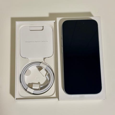Apple iPhone 15 mobiltelefon med 128 GB lagringskapasitet. Den er svart og leveres med original emballasje og tilbehør, inkludert ladekabel. Helt ny og ubrukt. Kun brutt forseglingen på esken.