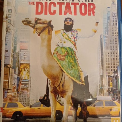 Uåpnet i plast The Dictator DVD med original cover og bilde av hovedkarakteren på kamel i bymiljø. DVD-en inneholder filmen The Dictator.