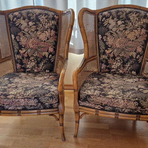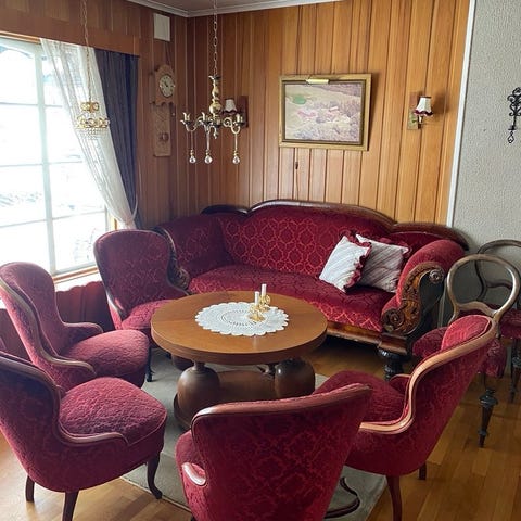 Antikk møbelsett bestående av sofa, to lenestoler, 8 spisestol, 2 dame lenestoler, og to bord. Treverk i mørk utførelse, polstret med mønstret grønt stoff. Passer til stue eller spisestue med klassisk interiør.