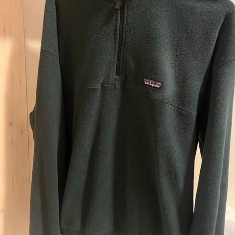 Patagonia fleecegenser for herre i størrelse L. Genseren er blå og laget av polyester. Den har hette og knappelukking på fronten.