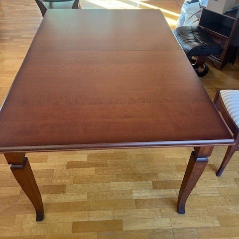 Spisebord med 10 matchende stoler i tre, egnet for spisestue. To skap i tre med dekorative detaljer og speil, passende for oppbevaring i hjemmet.