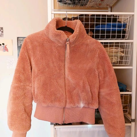 Jakke fra Bershka i størrelse XS-S, vil si den passer xs-m. Jakken er grønn og laget av bomull. Den har dekorative detaljer på baksiden med tekstilpynt i flere farger. Et lite merke i front som ikke er forsøkt fjernet - en pompom har falt av på bakside.