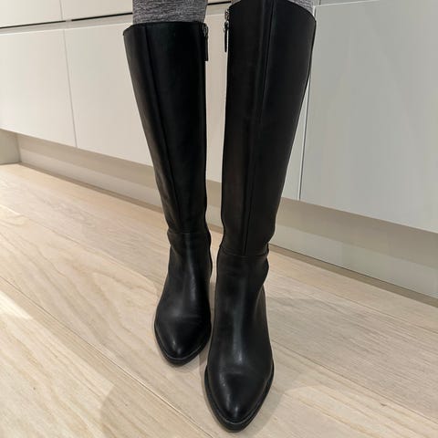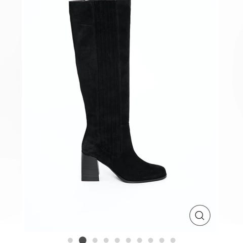 Tamaris støvler i størrelse 37, laget av svart skinn. Støvlene har en høy hæl og glidelås på innsiden for enkel påkledning. Egnet for selskapsbruk. Gir høyde og eleganse. Støvlene går over knærne (når ca 160)