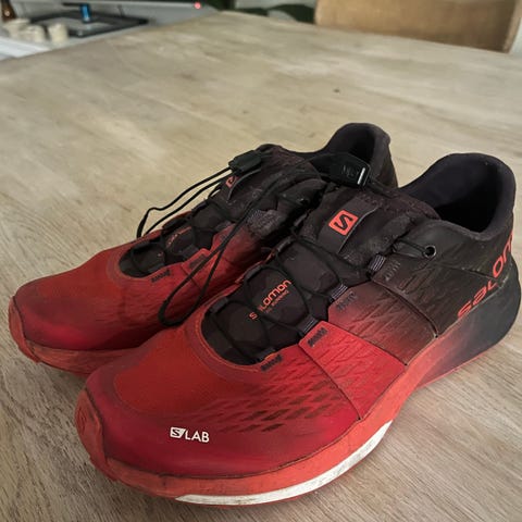 Salomon S-Lab løpesko i størrelse 42. Skoene er røde og designet for løping. Laget med materialer som gir god passform og ytelse under løpeaktiviteter.