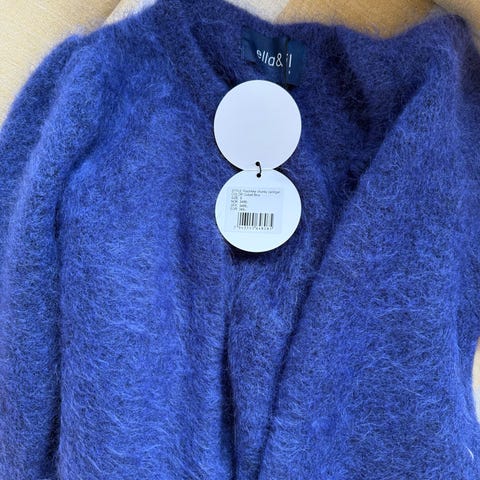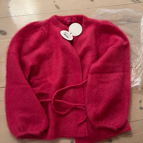 Selger en helt ny mohair cardigan fra det norske merket Ella&Il. Populær og etterspurt modell. Størrelse L. Nypris er 3500,- og lappen er fremdeles på. Kan sendes!