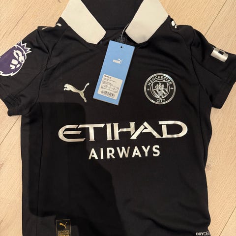 Manchester City bortedrakt 25/26 i størrelse 140. Helt ny ubrukt drakt med trykk, ny pris ca.1300 kr.
