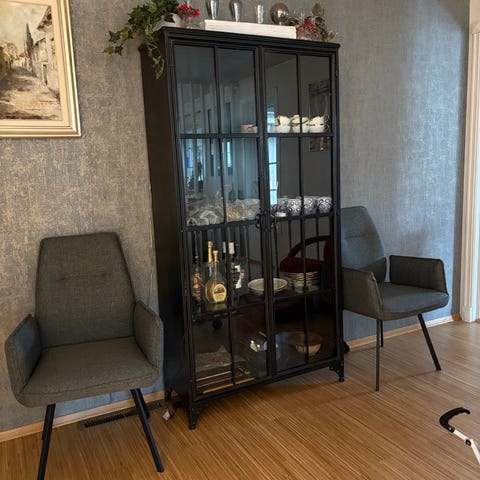 Skap i industridesign av klarlakkert, patinert metall med 2 vitrinedører i glass og tre. Dørene har metallhåndtak og magnetlås. 3 faste hylleplan i skapet.