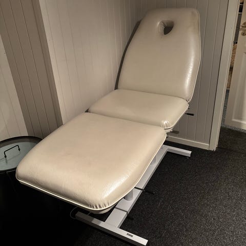 Behandlingsbenk i hvit farge med justerbare seksjoner. Benken har et hull for ansikt og kan tilpasses i flere posisjoner for ulike behandlingsbehov. Egnet for bruk i klinikker eller behandlingsrom.