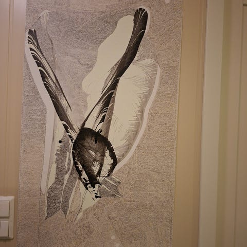 Stor tegning (høyde 158cm, bredde 100cm), sommerfugl-aktig, tegnet med små, små sirkler på store ark.