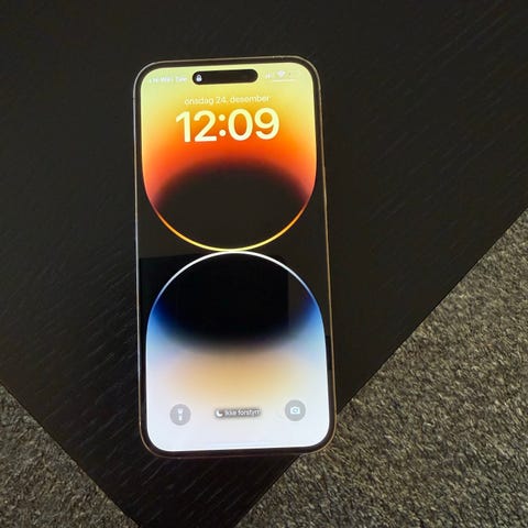 Apple iPhone 14 Pro mobiltelefon med 128 GB lagringskapasitet i deep purple farge. Enheten har en skjerm med flate kanter og tre kameraer på baksiden. Designet for bruk med iOS-operativsystemet.