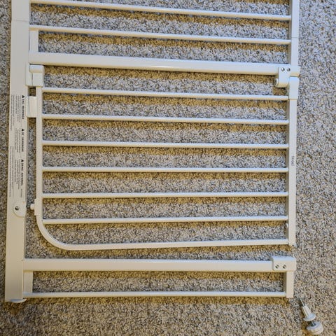Det ene hengselet til porten er ødelagt, men funker med gaffateip, og påvirker funksjonen minimalt. Ellers er grinda i fin stand og teppet er svært lite brukt.