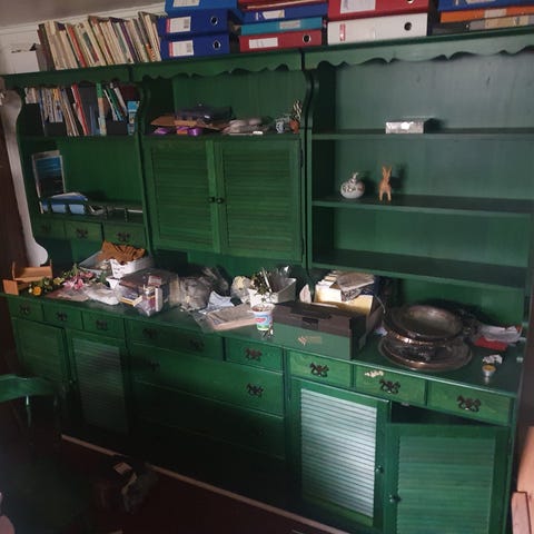 Mål: 204× 149 cm. Skapet er funksjonelt, med noen skader nederst på dørene og nederste karm.