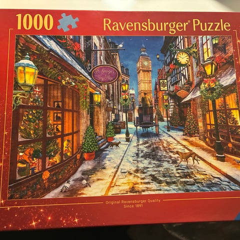 Ravensburger London's Christmas Spirit puslespill med 1000 biter. Puslespillet har et juletema med motiv fra London, inkludert byens kjente elementer som dobbeldekkerbuss og juledekorasjoner. Laget kun et gang.