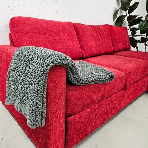 Selger en stor og lekker sovesofa fra i lilla tekstil.